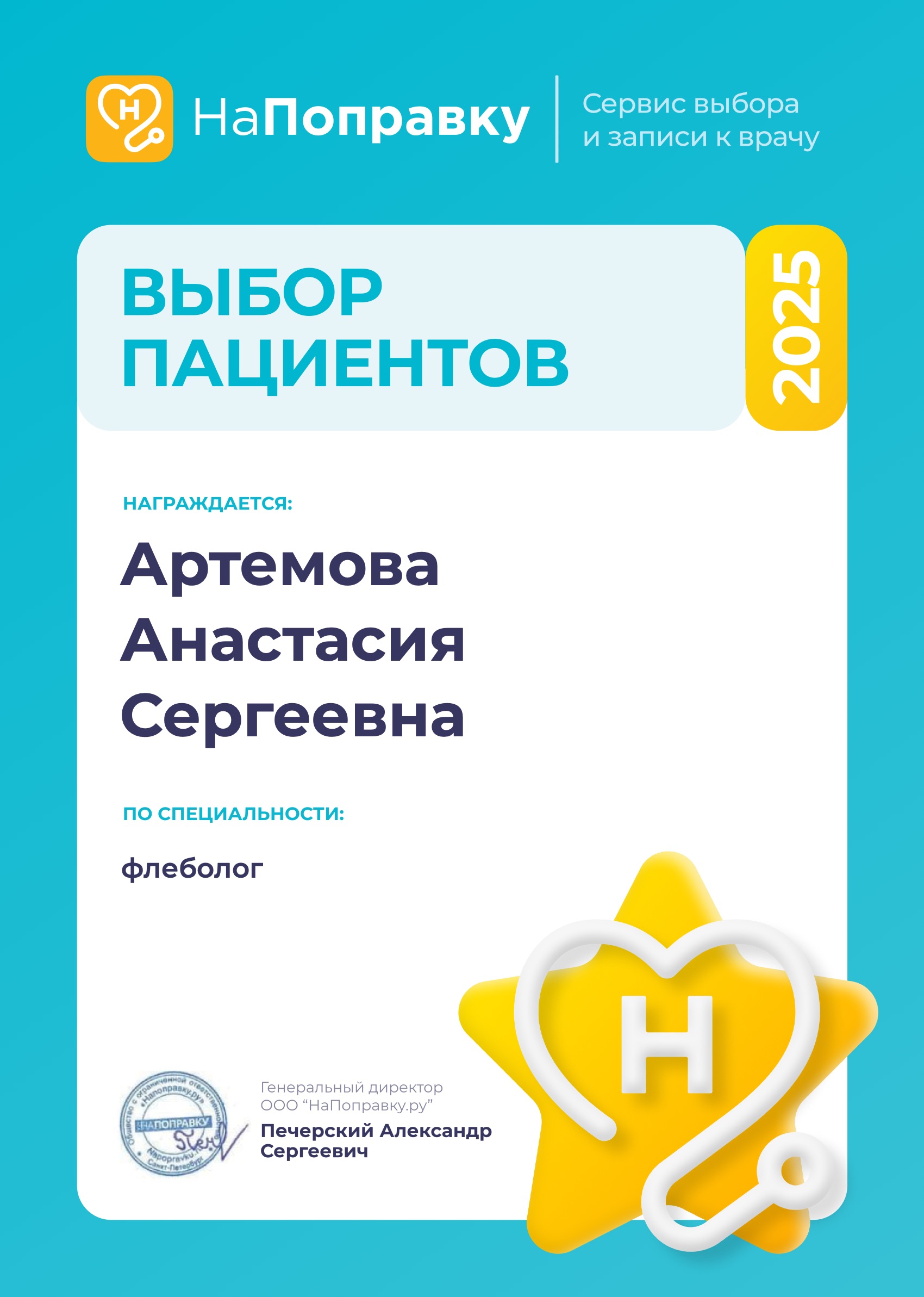 Добрый день! Хочу сказать слова благодарности Артемовой Анастасии Сергеевне,флебологу. Она лучшая, рассказала и объяснила состояние моих сосудов, направила на дополнительные обследования. После мне провели процедуру флэбэктомии, уже вторую в моей жизни. Анастасия Сергеевна сделала всё на высшем уровне! Моя нога теперь здорова и счастлива! Процедура прошла невероятно легко, я был окружён заботой и вниманием. Профессионализм врача достоен грамоты. Огромная благодарность Анастасии Сергеевне❤️
