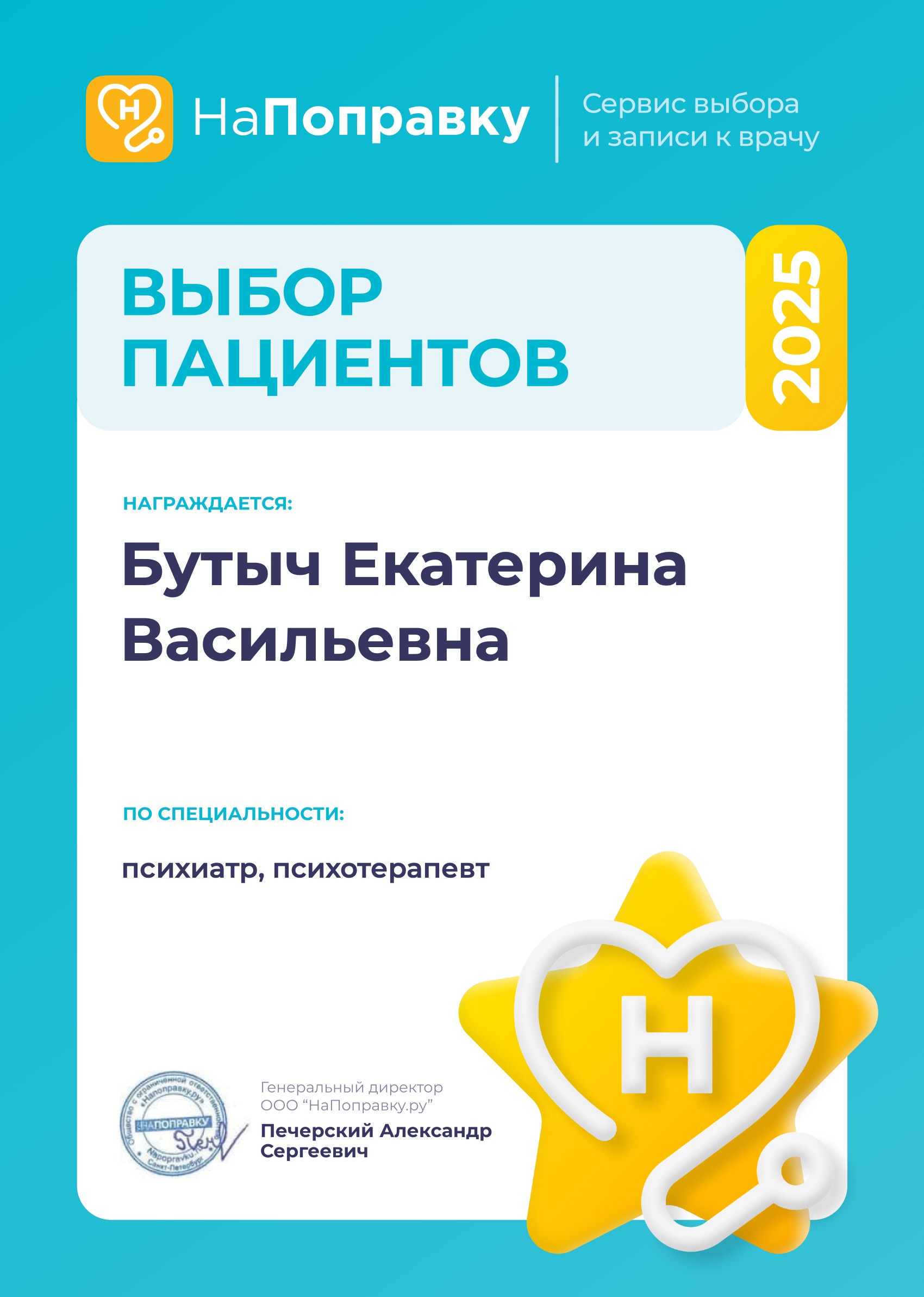 Бутыч Екатерина Васильевна - специалист своего дела, я пришла к ней с определенной проблемой, над которой мы работаем, мне действительно становится легче, чувствую результат. Данный врач очень приятная женщина, с которой приятно и комфортно на приемах