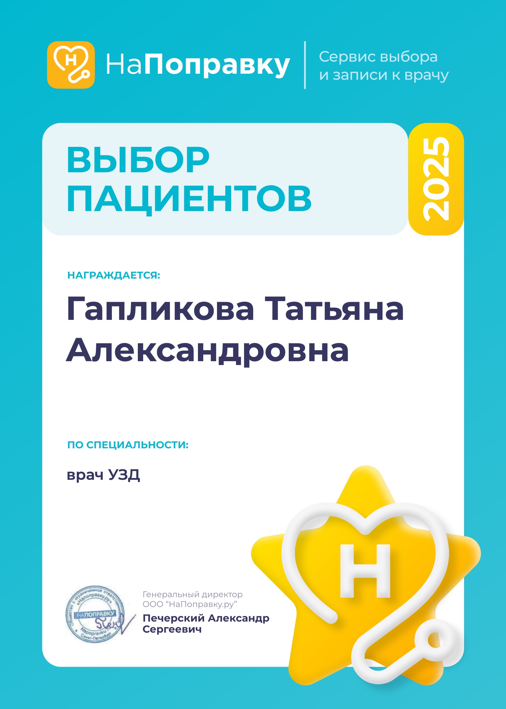 Хочу поблагодарить Гапликову Татьяну Александровну,внимательного,отзывчивого специалиста.Профессионализм на очень высоком уровне.Наблюдаюсь у Татьяны Александровны не первый год.Отличный специалист!!!Здоровья и огромное человеческое спасибо Вам,Татьяна Александровна.
