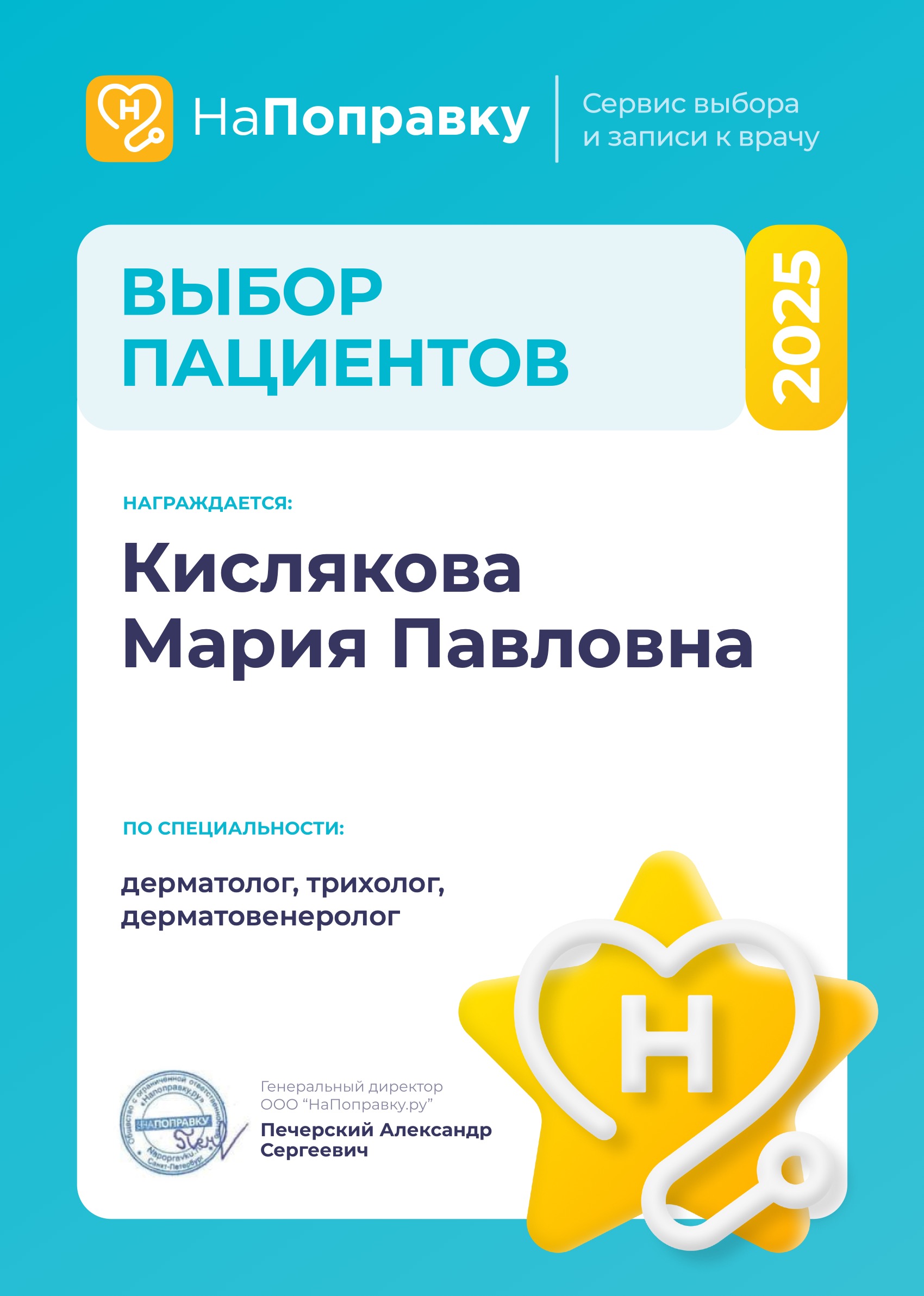 Был на приеме у дерматолога Кисляковой Марии Павловной, доктор произвела впечатление очень грамотного специалиста. Качественно и быстро провела осмотр и сделала необходимые манипуляции. Приёмом остался очень доволен!!