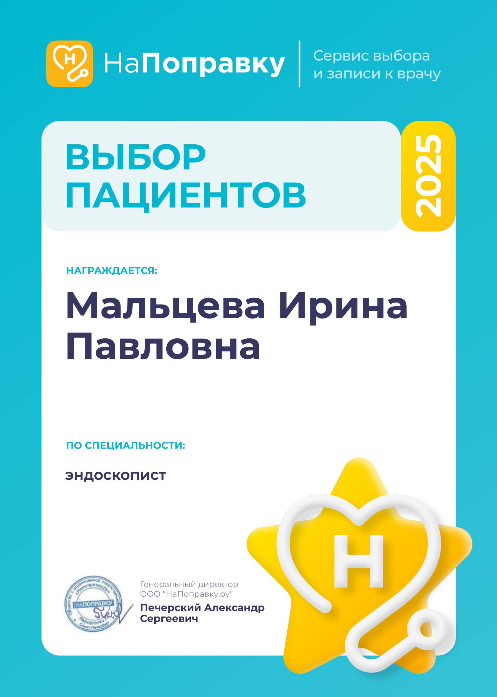 Хочу поблагодарить врача Мальцеву Ирину Павловну, за профессионально выполнение ФГДС. Хочу отметить, её доброжелательность, чёткость и внимание. Так же хочу сказать большое спасибо, всему коллективу медицинского центра " Династия ".