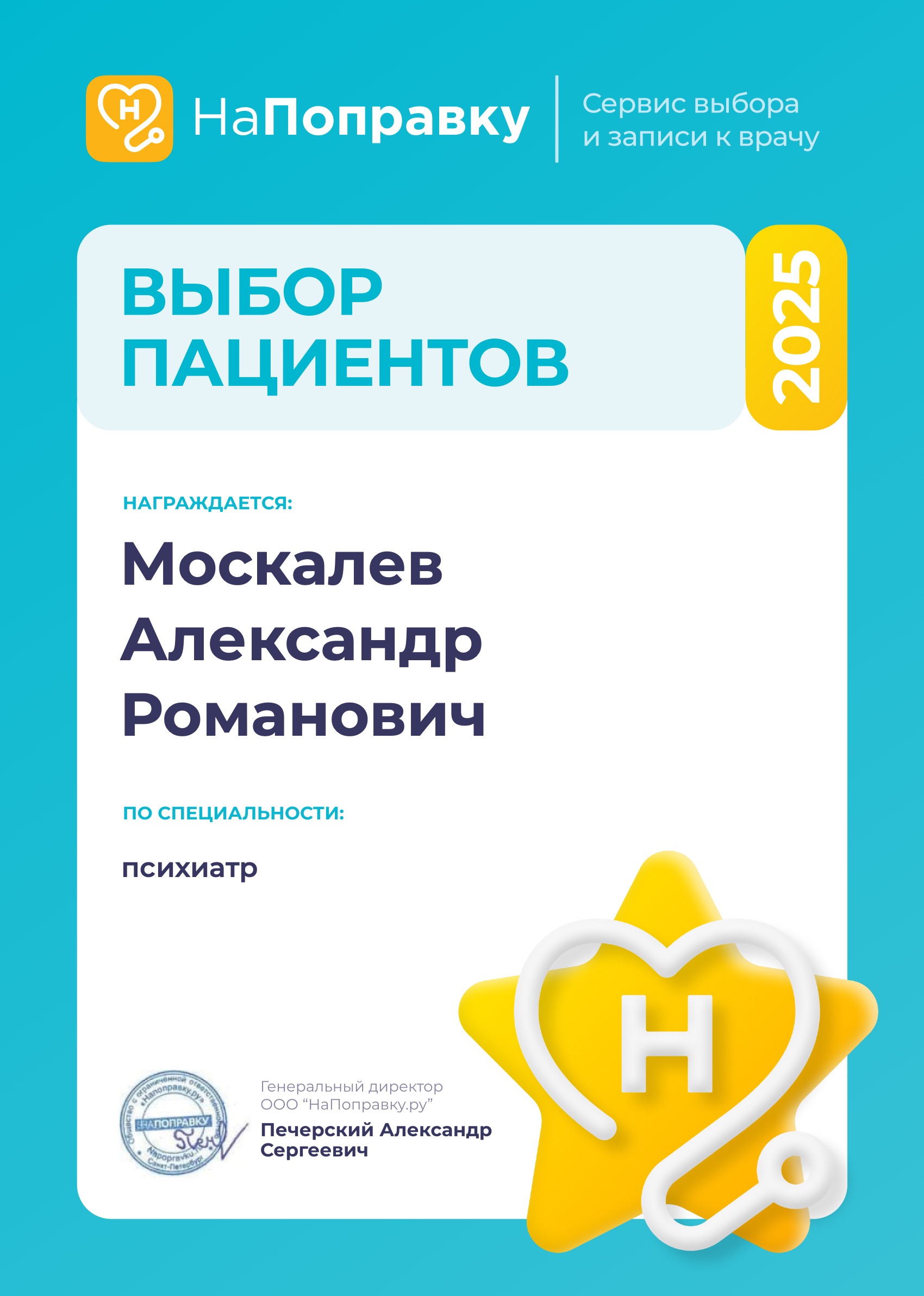 Врач-психиатр Александр Романович Москалёв прекрасный доктор, он буквально спас мою матушку (ей 91 год), которая почти не говорила, мало что понимала и помнила. Благодаря прописанному Александром Романовичем лекарству она почти восстановилась, свободно говорит, все понимает и многое помнит. Огромная благодарность замечательному врачу!